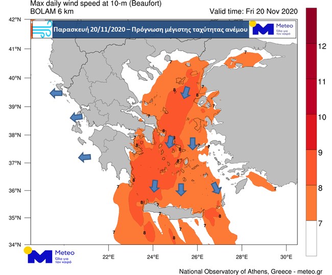 Ισχυροί έως θυελλώδεις 6-8 μποφόρ θα παραμείνουν οι βόρειοι άνεμοι στο Αιγαίο και σήμερα. Στο Ιόνιο οι ανατολικοί άνεμοι δεν θα ξεπερνούν τα 5 έως 6 μποφόρ. Η θερμοκρασία θα φτάσει τους 16-18 βαθμούς στα δυτικά ηπειρωτικά, τους 12-15 βαθμούς στα υπόλοιπα ηπειρωτικά και τους 13-16 βαθμούς στις νησιωτικές περιοχές.