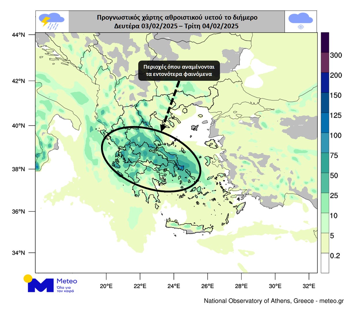 Σύμφωνα με τα προγνωστικά στοιχεία του meteo.gr / Εθνικού Αστεροσκοπείου Αθηνών, οι βροχές και οι τοπικές καταιγίδες που εκδηλώνονται από την αρχή της ημέρας στη δυτική και βορειοδυτική χώρα, αναμένεται κατά τη διάρκεια της Δευτέρας 03/02 να επεκταθούν ανατολικότερα.