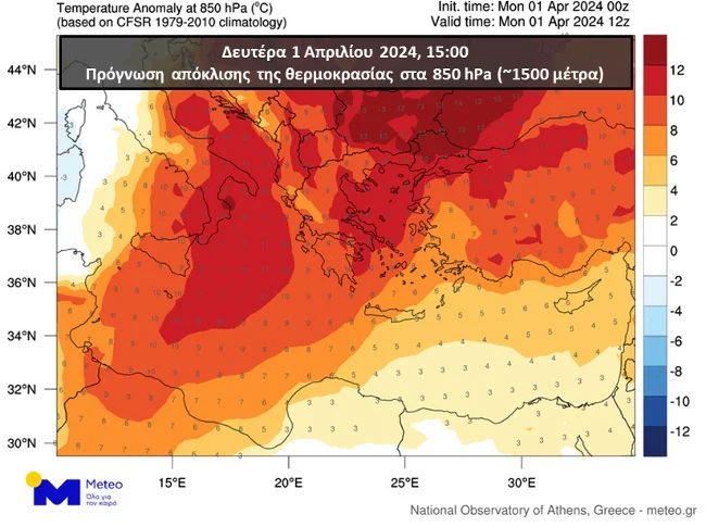 Όπως διακρίνεται στον παρακάτω Χάρτη 1, η θερμοκρασία στο επίπεδο των *850 hPa (περίπου 1500 μέτρα από την επιφάνεια της θάλασσας) τις μεσημεριανές ώρες της Δευτέρας 01/04 στα Βαλκάνια θα είναι 12-13 βαθμούς υψηλότερες από τα κανονικά για την εποχή επίπεδα, ενώ εστιάζοντας στη χώρα μας θα είναι έως 10-11 βαθμούς υψηλότερες.