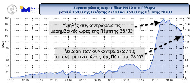 Σύμφωνα με καταγραφές του σταθμού ποιότητας αέρα του meteo.gr / Εθνικού Αστεροσκοπείου Αθηνών στο Ρέθυμνο, υψηλές συγκεντρώσεις Σαχαριανής σκόνης καταγράφηκαν τις μεσημβρινές ώρες της Πέμπτης 28/03. Όπως διακρίνεται και στο παρακάτω γράφημα, οι συγκεντρώσεις σωματιδίων PM10 ξεπέρασαν τα 180 μg/m³ στις 12:30 και έκτοτε σταδιακά υποχωρούν, όπως αναμενόταν άλλωστε και με βάση τα προγνωστικά στοιχεία του μοντέλου μεταφοράς σκόνης DUST/METEO του Εθνικού Αστεροσκοπείου Αθηνών.