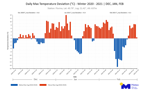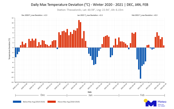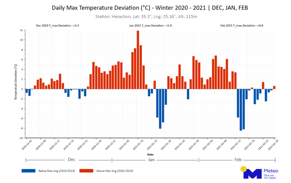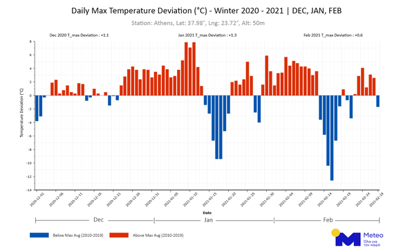 Ζεστός υπήρξε ο φετινός χειμώνας 2020-21, με εξαίρεση τις περιόδους δύο συγκεκριμένων κακοκαιριών (Λέανδρος 14-18/01/2021 και Μήδεια 13-17/02/2021), όπως προκύπτει από την ανάλυση της μέγιστης θερμοκρασίας ανά ημέρα και την απόκλισή της από τη μέση τιμή της τελευταίας δεκαετίας (2010-2019) για τέσσερις πόλεις της Ελλάδας, όπου λειτουργούν εδώ και πολλά χρόνια σταθμοί του Εθνικού Αστεροσκοπείου Αθηνών/meteo.gr.