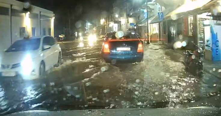 Πάντως, εμφανίστηκαν και τα πρώτα προβλήματα στο Νησί, με δρόμους και σοκάκια να πλημμυρίζουν και να μετατρέπονται σε ποτάμια.