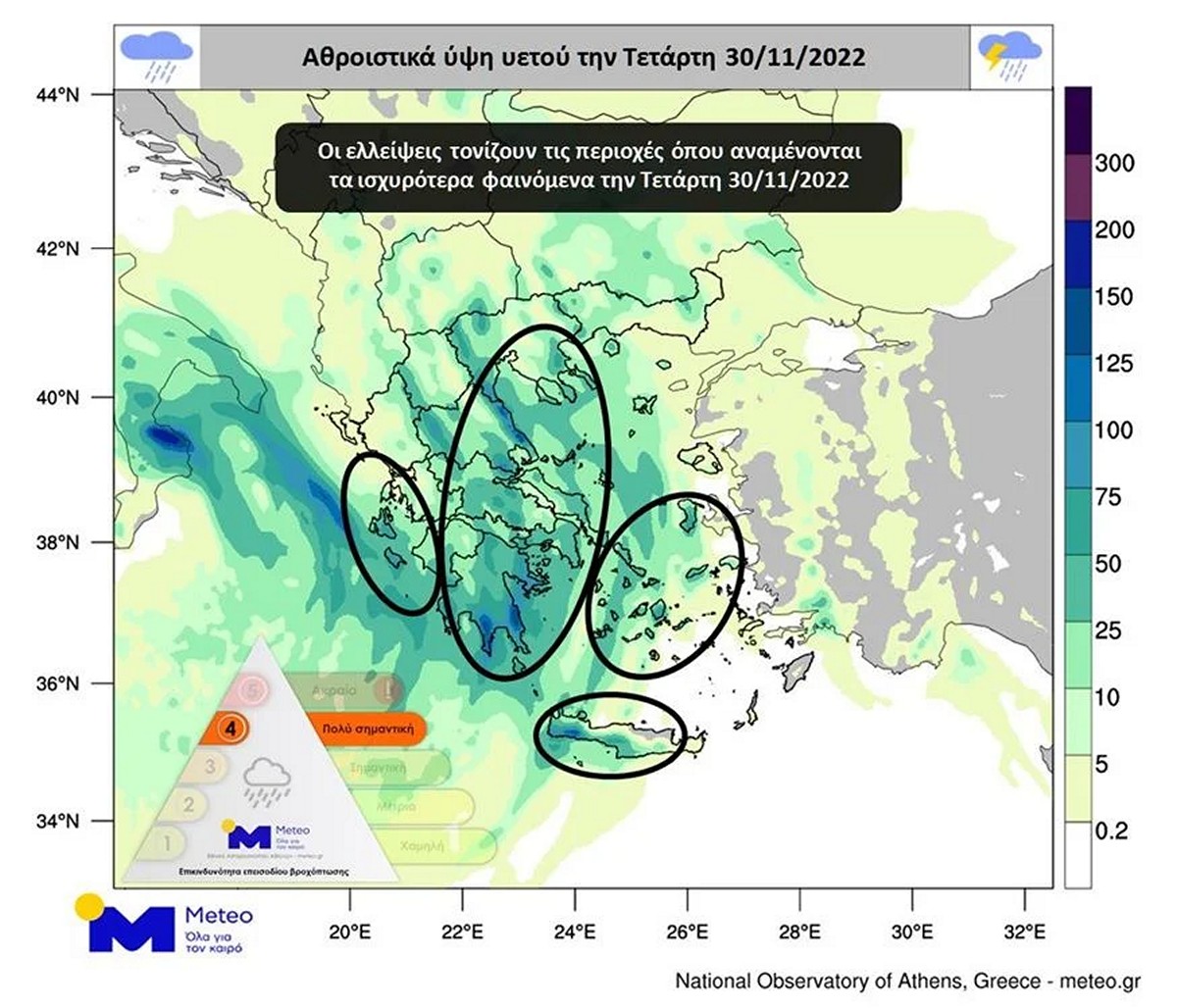 - Α. Στο Ιόνιο, την Πελοπόννησο, τη δυτική και την ανατολική Στερεά (συμπεριλαμβανομένης της Αττικής), την Εύβοια και τη δυτική και τη νότια Κρήτη μέχρι τις προμεσημβρινές ώρες της Πέμπτης (01-12-2022).