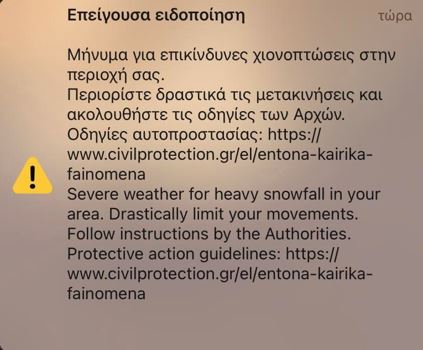 Συγκεκριμένα το μήνυμα αναφέρει: «Μήνυμα για επικίνδυνες χιονοπτώσεις στην περιοχή σας. Περιορίστε δραστικά τις μετακινήσεις και ακολουθήστε τις οδηγίες των Αρχών.