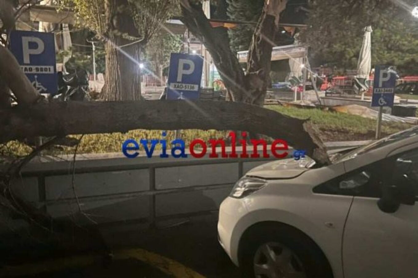 Σύμφωνα με το eviaonline.gr, δέντρα ξεριζώθηκαν στην πλατεία Αγία Νικολάου και έπεσαν πάνω σε σταθμευμένα οχήματα, ενώ την ίδια ώρα αναποδογύρισαν και κάδοι απορριμμάτων με αποτέλεσμα τα σκουπίδια να διασκορπιστούν.