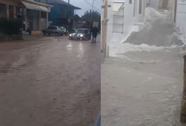 Οι καταρρακτώδεις βροχές έχουν μετατρέψει τους δρόμους σε χείμαρρους, όπως φαίνεται σε σχετικό βίντεο που δημοσίευσε ο «ΚΥΚΛΩΝΑΣ ΡΟΔΟΥ».