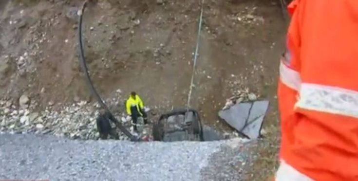 Στο σημείο βρίσκεται μπουλντόζα, η οποία έχει δέσει ιμάντα στον άξονα του αυτοκινήτου προκειμένου να το τραβήξουν προς τα πάνω και να απεγκλωβίσουν τον οδηγό, ενώ σε ετοιμότητα βρίσκεται και φορείο προκείμενου να τον απομακρύνουν με ασφάλεια.