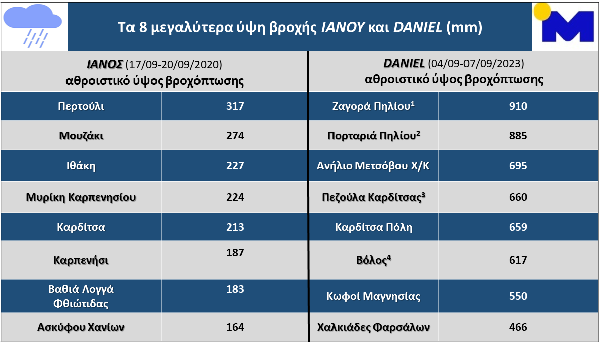 Αναλυτικά, σύμφωνα με το δίκτυο αυτόματων μετεωρολογικών σταθμών του Εθνικού Αστεροσκοπείου Αθηνών / meteo.gr κατά τη διάρκεια της κακοκαιρίας Daniel (04-07/09/2023) καταγράφηκαν πολύ μεγαλύτερα ύψη βροχόπτωσης σε σχέση με εκείνα που είχαν καταγραφεί ως αποτέλεσμα του Μεσογειακού Κυκλώνα Ιανού (17-20/09/2020).
