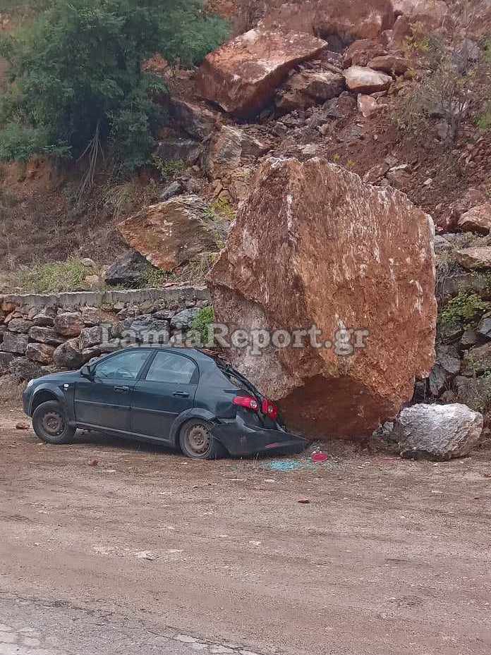 Από θαύμα σώθηκε οδηγός αυτοκινήτου έξω από μοναστήρι στη Λαμία, όταν το όχημά του καταπλακώθηκε από βράχο.