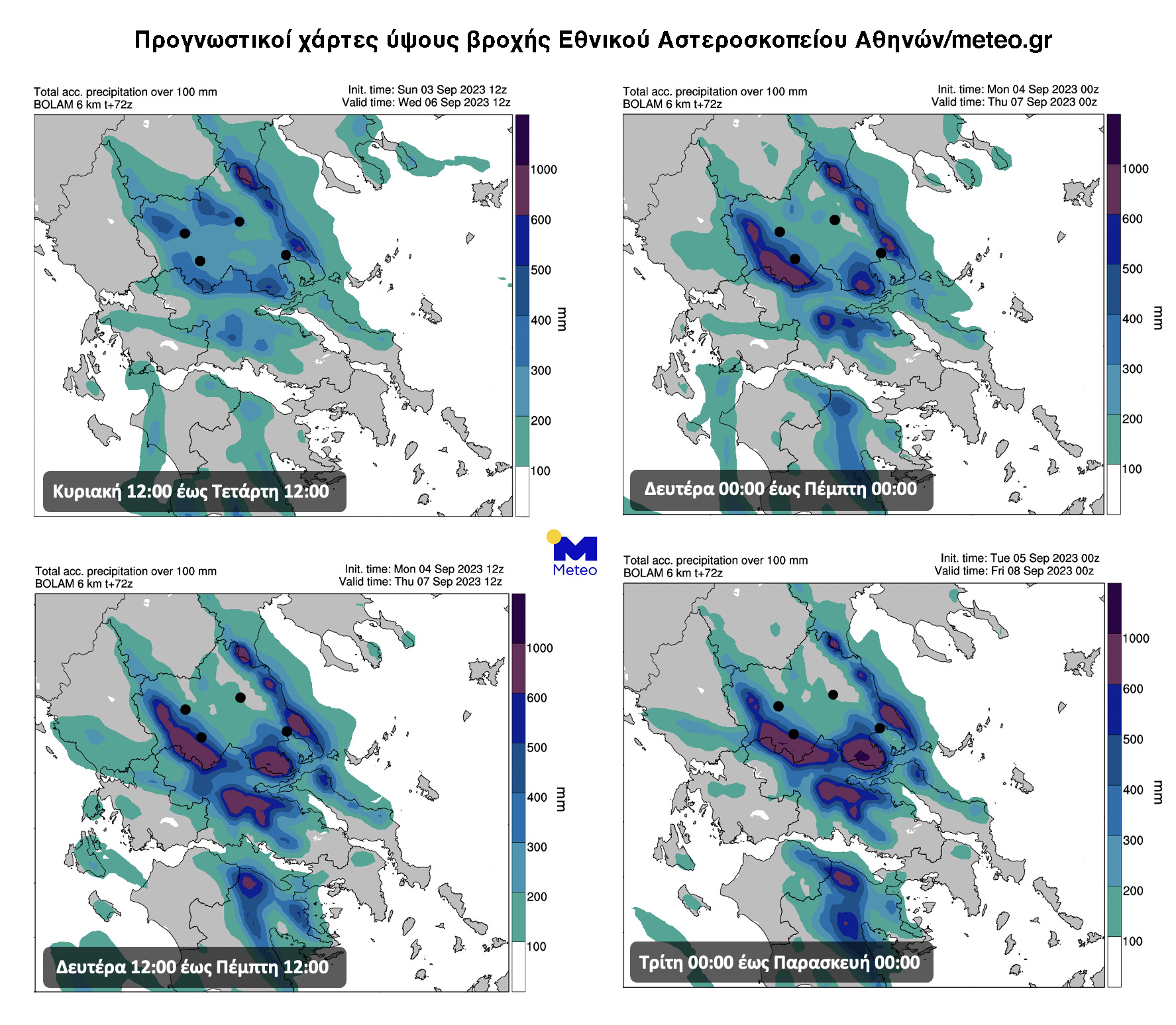 Οι χάρτες που παρουσιάζονται δείχνουν το συνολικό προβλεπόμενο ύψος βροχής σε χιλιοστά με χρονικό ορίζοντα 72 ωρών από τις 4 αρχικοποιήσεις του αριθμητικού μοντέλου πρόγνωσης καιρού του Εθνικού Αστεροσκοπείου Αθηνών/meteo.gr μεταξύ Κυριακής 3 και Τρίτης 5 Σεπτεμβρίου 2023.