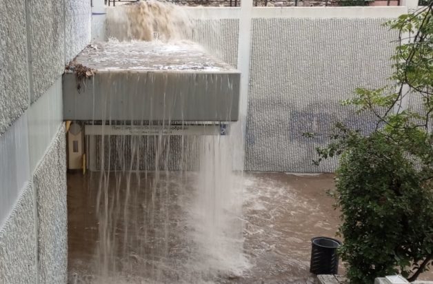 Το νερό έχει φτάσει το 1μ. στην υπόγεια διάβαση. Η μισή πόρτα του ασανσέρ έχει εξαφανιστεί κάτω από το νερό.
