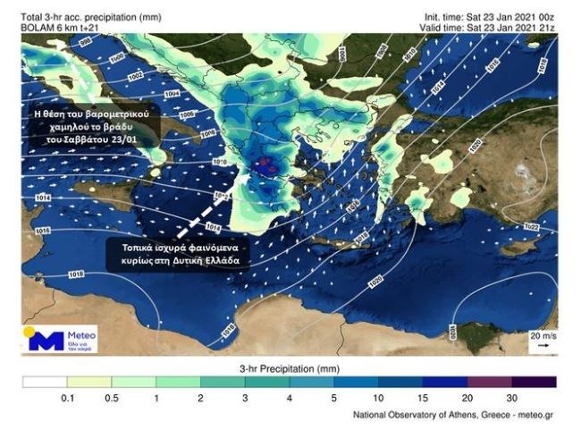 Διαδοχικά κύματα κακοκαιρίας, κινούμενα από τα βορειοδυτικά προς τα ανατολικά, αναμένεται να επηρεάσουν τη χώρα έως τα μέσα της νέας εβδομάδας σύμφωνα με τα προγνωστικά στοιχεία του Εθνικού Αστεροσκοπείου Αθηνών / meteo.gr. Το πρώτο κύμα κακοκαιρίας, θα επηρεάσει από τις μεσημεριανές ώρες του Σαββάτου 23/01 τη Δυτική Ελλάδα με τοπικά ισχυρές βροχές και καταιγίδες και χιονοπτώσεις στα ορεινά. Τα έντονα φαινόμενα προοδευτικά θα επεκταθούν σχεδόν στο σύνολο της ηπειρωτικής χώρας και το βράδυ στο Κεντρικό και Βόρειο Αιγαίο. Τοπικά θυελλώδεις άνεμοι νοτίων διευθύνσεων θα επικρατήσουν στα πελάγη. Μέχρι το μεσημέρι της Κυριακής 24/01 ο καιρός θα παρουσιάσει πρόσκαιρη βελτίωση σχεδόν σε όλη τη χώρα, με παράλληλη πρόσκαιρη εξασθένηση των ανέμων. Στους προγνωστικούς χάρτες που ακολουθούν παρουσιάζονται η κατανομή των φαινομένων και οι άνεμοι που θα πνέουν, αργά το βράδυ του Σαββάτου 23/01 και τις πρώτες μεταμεσονύκτιες ώρες προς Κυριακή 24/01.