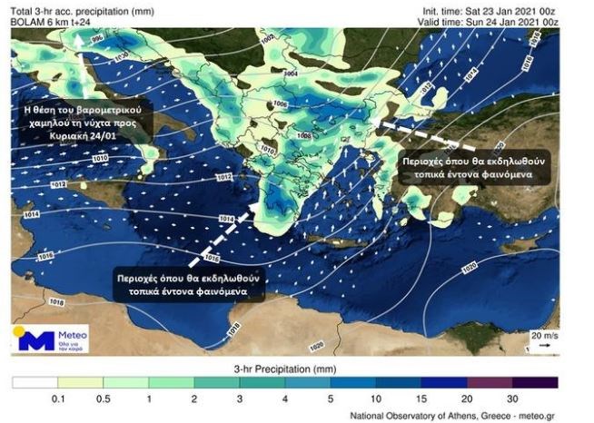 Διαδοχικά κύματα κακοκαιρίας, κινούμενα από τα βορειοδυτικά προς τα ανατολικά, αναμένεται να επηρεάσουν τη χώρα έως τα μέσα της νέας εβδομάδας σύμφωνα με τα προγνωστικά στοιχεία του Εθνικού Αστεροσκοπείου Αθηνών / meteo.gr. Το πρώτο κύμα κακοκαιρίας, θα επηρεάσει από τις μεσημεριανές ώρες του Σαββάτου 23/01 τη Δυτική Ελλάδα με τοπικά ισχυρές βροχές και καταιγίδες και χιονοπτώσεις στα ορεινά. Τα έντονα φαινόμενα προοδευτικά θα επεκταθούν σχεδόν στο σύνολο της ηπειρωτικής χώρας και το βράδυ στο Κεντρικό και Βόρειο Αιγαίο. Τοπικά θυελλώδεις άνεμοι νοτίων διευθύνσεων θα επικρατήσουν στα πελάγη. Μέχρι το μεσημέρι της Κυριακής 24/01 ο καιρός θα παρουσιάσει πρόσκαιρη βελτίωση σχεδόν σε όλη τη χώρα, με παράλληλη πρόσκαιρη εξασθένηση των ανέμων. Στους προγνωστικούς χάρτες που ακολουθούν παρουσιάζονται η κατανομή των φαινομένων και οι άνεμοι που θα πνέουν, αργά το βράδυ του Σαββάτου 23/01 και τις πρώτες μεταμεσονύκτιες ώρες προς Κυριακή 24/01.