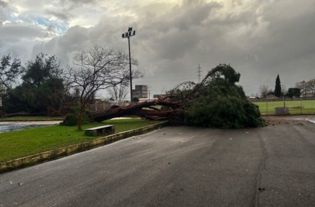 Σοβαρές ζημιές έχουν προκληθεί στο βοηθητικό γήπεδο ποδοσφαίρου ενώ καταγράφονται τόσο στον εξωτερικό όσο και στον εσωτερικό χώρο του ΔΑΚ πτώσεις δέντρων.