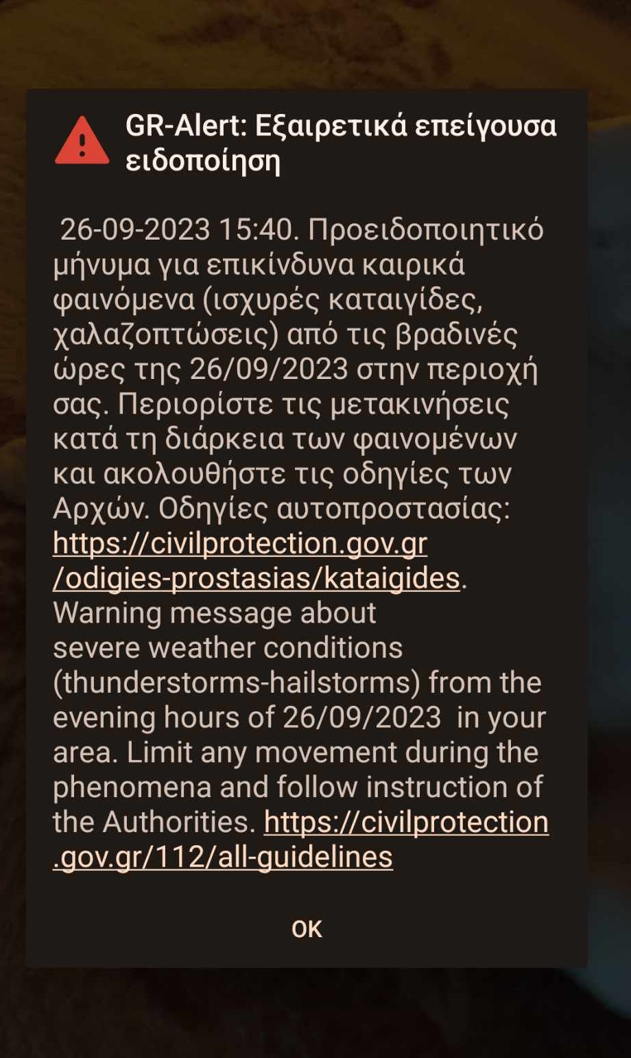 🆘 Προειδοποιητικό μήνυμα για επικίνδυνα καιρικά φαινόμενα (ισχυρές καταιγίδες, χαλαζοπτώσεις) από τις βραδινές ώρες της 26/09/2023 στην περιοχή σας