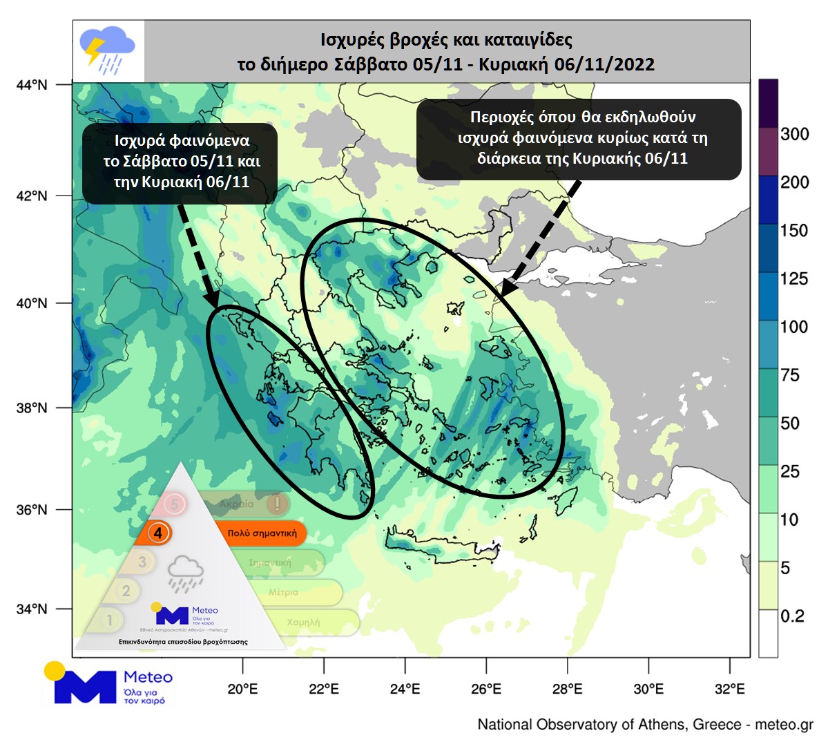 Όσον αφορά τον Δείκτη Επικινδυνότητας Επεισοδίου Βροχόπτωσης (Regional Precipitation Index – RPI), το επεισόδιο βροχόπτωσης αναμένεται να είναι Κατηγορίας 3 το Σάββατο 05/11 και Κατηγορίας 4 την Κυριακή 06/11. Στον παρακάτω προγνωστικό χάρτη αποτυπώνονται τα εκτιμώμενα συνολικά ύψη βροχόπτωσης σε χιλιοστά έως το βράδυ της Κυριακής 06/11.