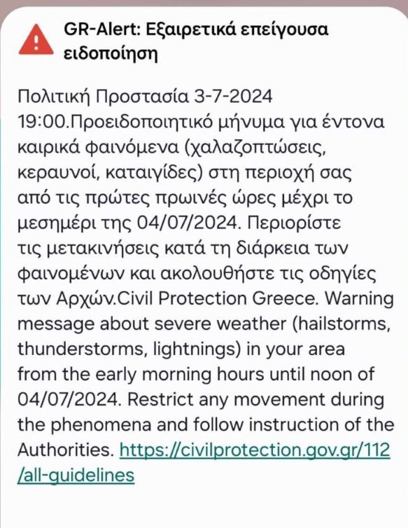«Προειδοποιητικό μήνυμα για έντονα καιρικά φαινόμενα (χαλαζοπτώσεις, κεραυνοί, καταιγίδες) στην περιοχή σας από τις πρώτες πρωινές ώρες μέχρι το μεσημέρι της 4/7/2024. Περιορίστε τις μετακινήσεις κατά τη διάρκεια των φαινομένων και ακολουθήστε τις οδηγίες των αρχών», αναφέρεται στο μήνυμα που εστάλη μέσω του 112 στους κατοίκους της Θεσσαλονίκης.