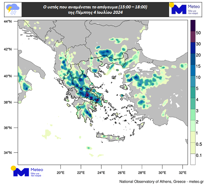 Στον χάρτη που ακολουθεί παρουσιάζεται ενδεικτικά ο υετός που αναμένεται τις πρώτες πρωινές ώρες και το απόγευμα της Πέμπτης 4/7: