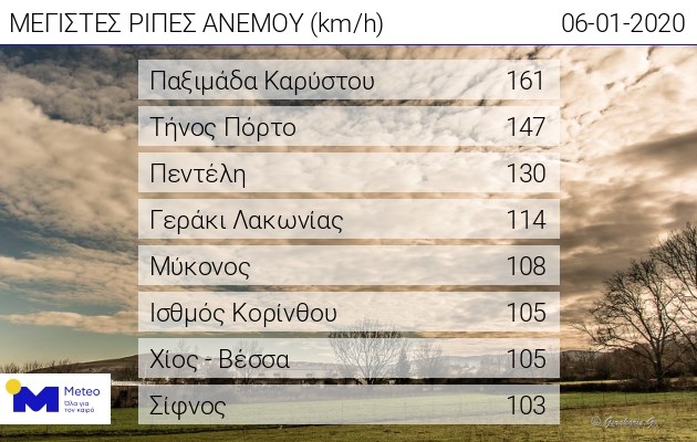 Άνεμοι σε επίπεδο θύελλας επικρατούν τις πρωινές ώρες των Θεοφανείων στο Αιγαίο. Με τις ταχύτητες του ανέμου να φθάνουν στα 161 km/h στην Παξιμάδα Καρύστου και τα 147 km/h στη νότια Τήνο.