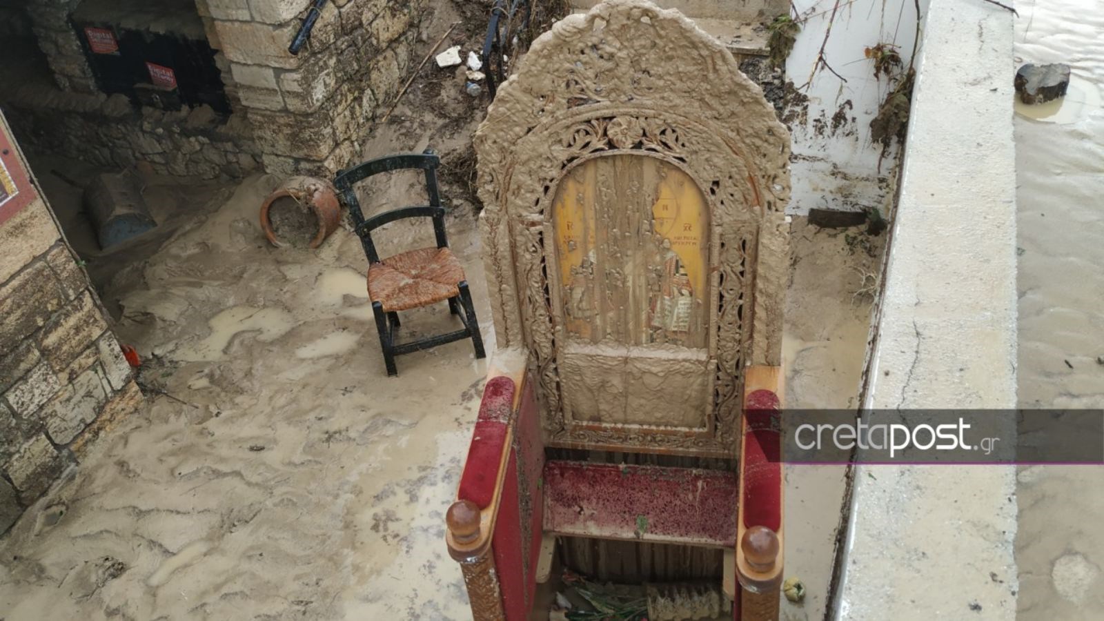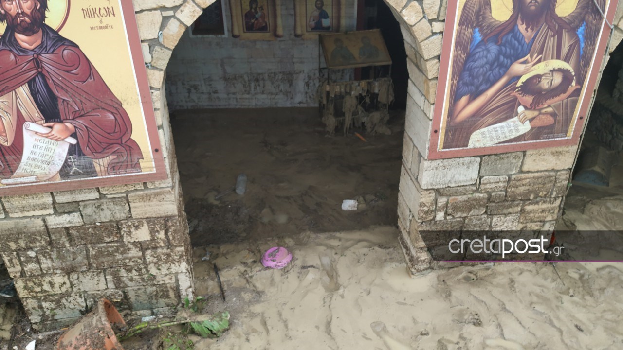 Αποκαρδιωτικές είναι οι εικόνες από το εσωτερικό του ναού του Αγίου Ιωάννη Προδρόμου και του Αγίου Νίκωνος του Μετανοείται στον Καρτερό. Το ξωκλήσι θάφτηκε στη λάσπη, όπως φαίνεται στις φωτογραφίες του Cretapost.gr