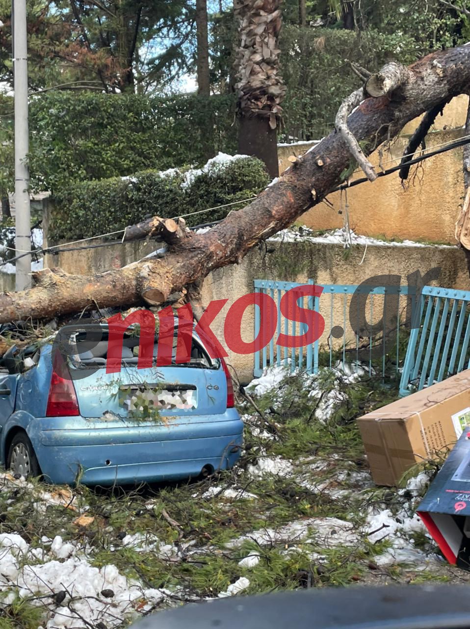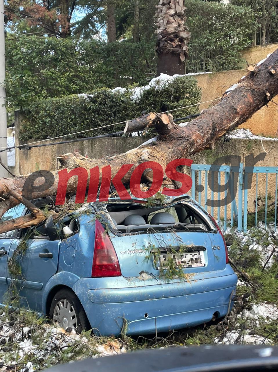 Όπως φαίνεται στις εικόνες που έστειλε αναγνώστης του enikos.gr, το αυτοκίνητο διαλύθηκε από τον κορμό του δέντρου που έπεσε πάνω του.