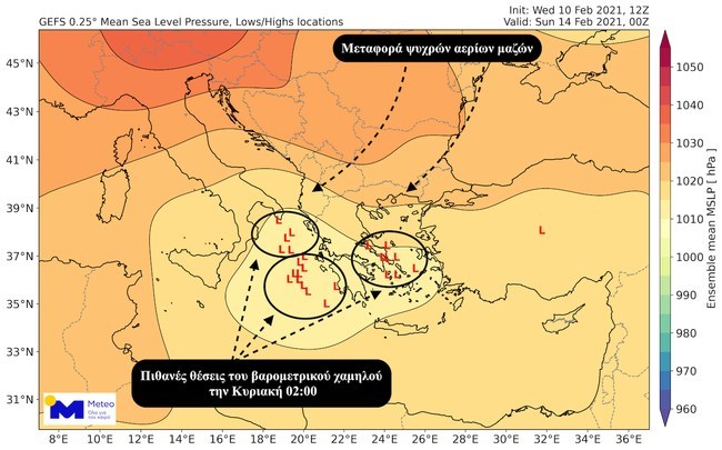 Όπως φαίνεται στο παρακάτω γράφημα οι πιθανές θέσεις αποκλίνουν πολύ μεταξύ τους, με κάποια σενάρια να προβλέπουν τη θέση του στο βόρειο Ιόνιο και κάποια άλλα στο νότιο, ενώ ένα μέρος των πιθανών θέσεων είναι στο κεντρικό Αιγαίο. Αυτό έχει ως αποτέλεσμα την μεγάλη αβεβαιότητα στη κατανομή των χιονοπτώσεων και την ένταση τους. Για παράδειγμα, αν επαληθευθεί ένα σενάριο όπου το βαρομετρικό χαμηλό βρίσκεται στο Β. Ιόνιο τότε η ζώνη των έντονων χιονοπτώσεων θα εντοπίζεται στη Δυτική Μακεδονία, στα ορεινά της Ηπείρου και στη Δυτική Θεσσαλία. Σε ένα άλλο όμως σενάριο όπου το βαρομετρικό χαμηλό βρεθεί στο κεντρικό και νότιο Ιόνιο τα έντονα φαινόμενα θα εντοπίζονται πιο νότια και οι χιονοπτώσεις στην Ήπειρο πιθανώς να εντοπίζονται σε ακόμα χαμηλότερα υψόμετρα.