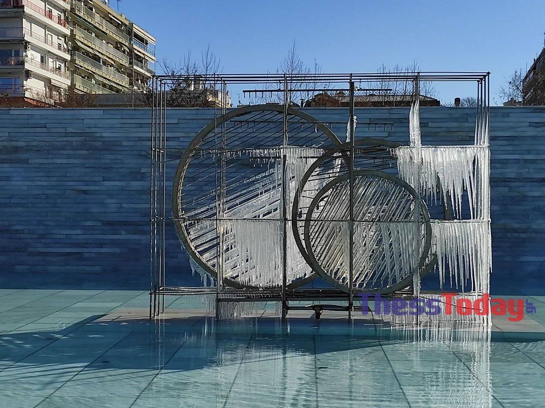 Οι εικόνες παγετού στο κέντρο της πόλης συνεχίζονται κατά μήκος της Νέας Παραλίας, καθώς στο υδροκίνητο έργο “Τρεις Κύκλοι”, στον “Κήπο των Γλυπτών” έχουν δημιουργηθεί σταλακτίτες.