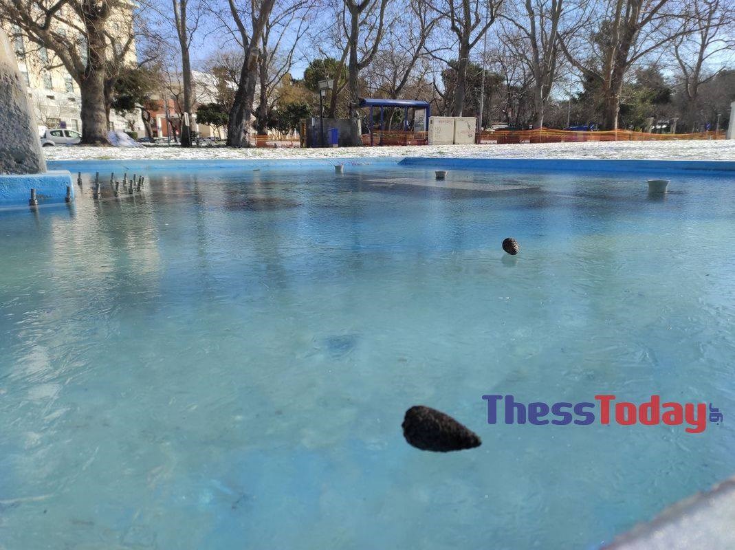 Εξαιτίας των χαμηλών θερμοκρασιών που επικρατούν στην περιοχή το σιντριβάνι που βρίσκεται πλησίον του Βασιλικού Θεάτρου στην περιοχή του Λευκού Πύργου πάγωσε και μετατράπηκε σε μικρό παγοδρόμιο.