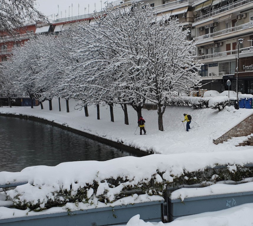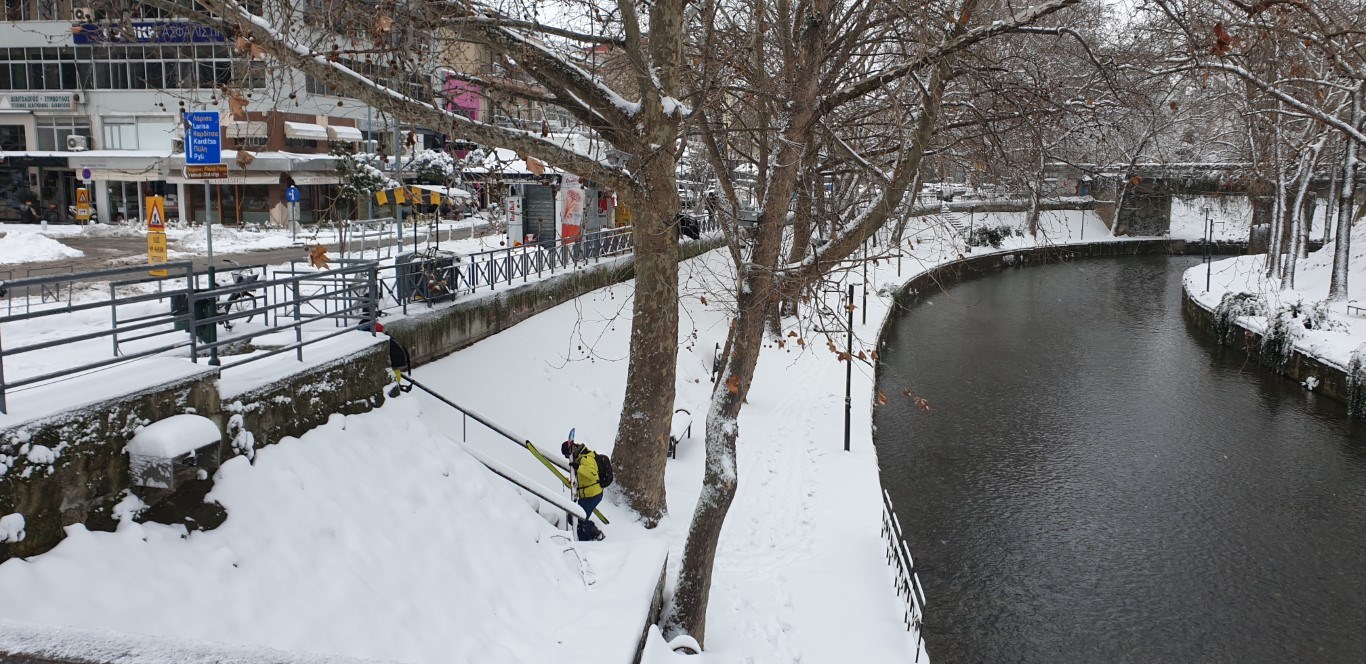 Το χιόνι στο κέντρο της πόλης φτάνει τα 10 εκατοστά και σύμφωνα με το trikalavoice.gr δύο τολμηροί πήραν τα σκι τους και έκαναν κατάβαση στις όχθες του Ληθαίου ποταμού.