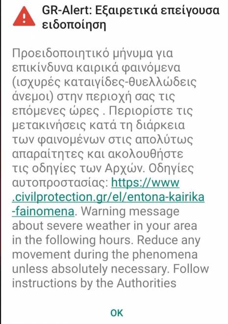 Συγκεκριμένα, οι κάτοικοι σε Αχαΐα και Ζάκυνθο έλαβαν στα κινητά τους τηλέφωνα ένα προειδοποιητικό μήνυμα για επικίνδυνα καιρικά φαινόμενα στην περιοχή τους, τις επόμενες ώρες, και γίνεται η σύσταση να περιορίσουν τις μετακινήσεις τους στις απολύτως απαραίτητες και να ακολουθούν τις οδηγίες των Αρχών.