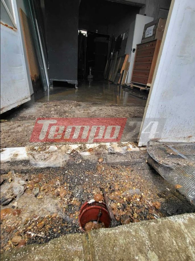 Οι ιδιοκτήτες προσπαθούν να σώσουν ό,τι μπορούν.  Όπως περιγράφουν στο tempo24, ένα φρεάτιο έχει βουλώσει με αποτέλεσμα όλα τα νερά από τις βροχές να μπουν στην επιχείρησή τους προκαλώντας τεράστια ζημιά.