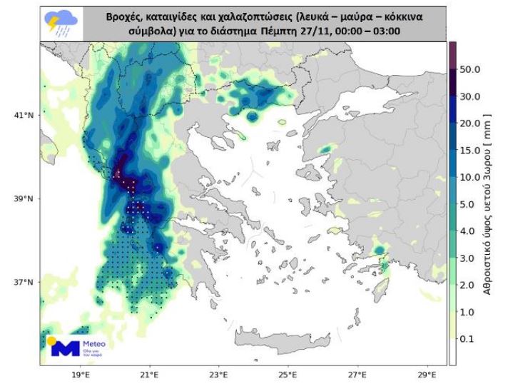 Στους προγνωστικούς χάρτες που ακολουθούν για τα διαστήματα Πέμπτη 27/11, 00:00 – 03:00 , Πέμπτη 27/11, 09:00 – 12:00 και Πέμπτη 27/11, 21:00 – 24:00 αποτυπώνονται οι περιοχές όπου θα εκδηλωθούν βροχές ή καταιγίδες και οι περιοχές όπου εντοπίζεται η μεγαλύτερη πιθανότητα εκδήλωσης χαλαζοπτώσεων.