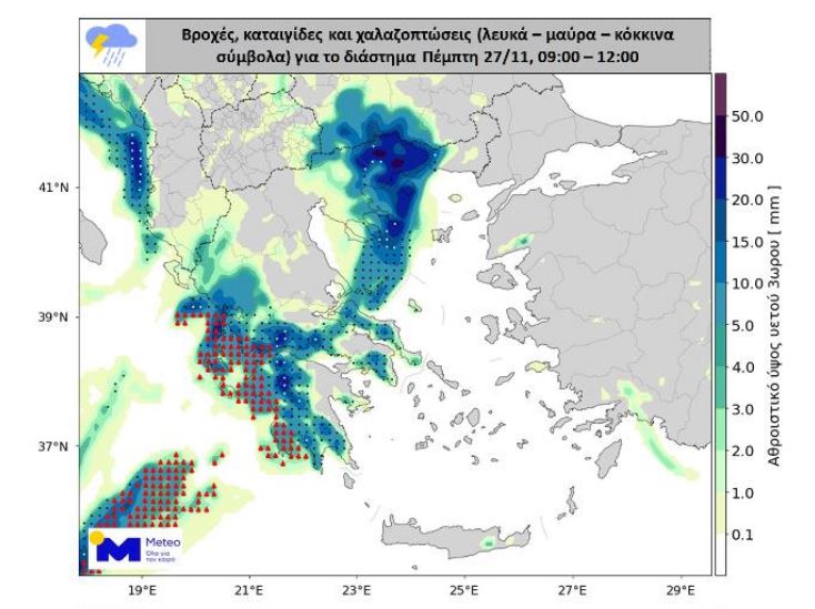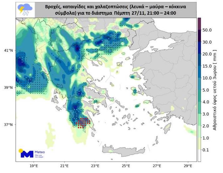 Την Πέμπτη 27/11 έντονες και τοπικά πολύ έντονες βροχοπτώσεις και καταιγίδες θα εκδηλώνονται κατά περιόδους στα Επτάνησα, στα δυτικά ηπειρωτικά, στην Πελοπόννησο, στην Ανατολική Μακεδονία και στη Θράκη, συνοδευόμενα κατά τόπους από χαλαζοπτώσεις. Επισημαίνεται ότι στα Επτάνησα, στα δυτικά ηπειρωτικά και δευτερευόντως στην Πελοπόννησο το χαλάζι ενδέχεται να έχει σχετικά μεγάλο μέγεθος. Στην υπόλοιπη χώρα θα εκδηλωθούν επίσης βροχές και σποραδικές καταιγίδες, με παροδικά έντονα φαινόμενα. Στις περιοχές που θα επηρεαστούν συμπεριλαμβάνονται οι πόλεις της Αθήνας και της Θεσσαλονίκης.