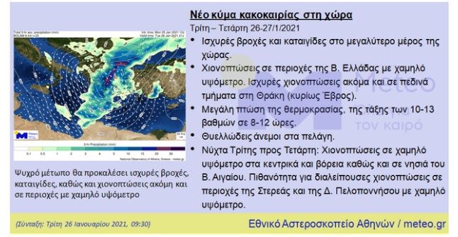Σε εξέλιξη βρίσκεται το νέο κύμα κακοκαιρίας, με βροχές και σποραδικές καταιγίδες να σημειώνονται από σήμερα το πρωί, κυρίως στα δυτικά τμήματα της χώρας. Τα κυριότερα χαρακτηριστικά του νέου κύματος κακοκαιρίας κατά το διήμερο Τρίτης και Τετάρτης, σύμφωνα με το meteo του Εθνικού Αστεροσκοπείου Αθηνών, είναι οι χιονοπτώσεις ακόμη και σε περιοχές χαμηλού υψομέτρου αρχικά της Βόρειας Ελλάδας (ακόμη και σε πεδινά τμήματα της Θράκης, κυρίως στον Έβρο), οι ισχυρές κατά τόπους βροχές και καταιγίδες στο μεγαλύτερο μέρος της χώρας, η πτώση της θερμοκρασίας της τάξης των δέκα έως 12 βαθμών μέσα σε μόνο οκτώ έως 12 ώρες και οι θυελλώδεις άνεμοι στα πελάγη.