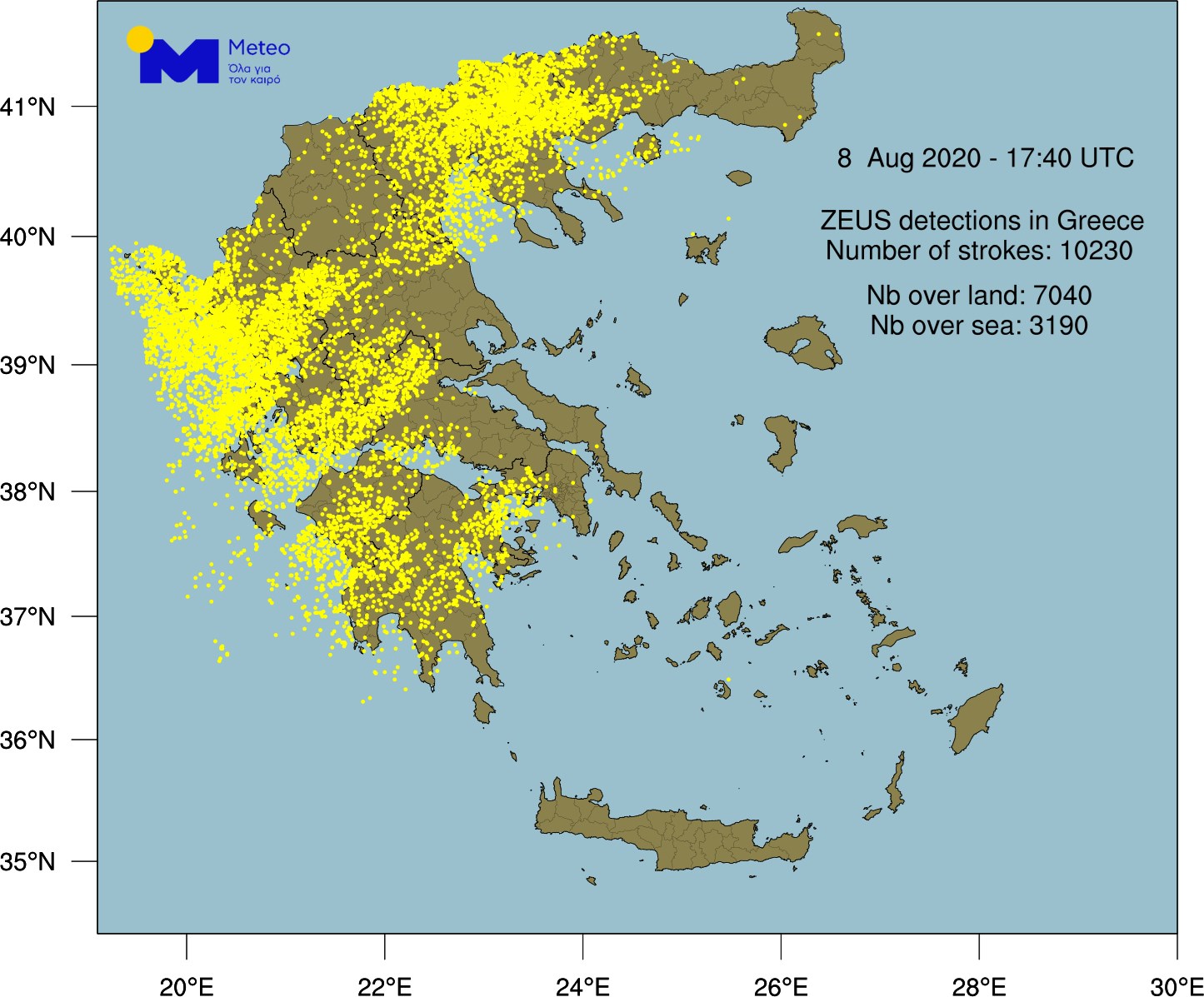 Σαρώνει την Ελλάδα η κακοκαιρία “Θάλεια”, με κύρια χαρακτηριστικά τις ισχυρές βροχές και καταιγίδες. Σύμφωνα με το meteo.gr, 10.000 κεραυνούς κατέγραψε το δίκτυο καταγραφής κεραυνών «ΖΕΥΣ» του Εθνικού Αστεροσκοπείου Αθηνών έως το βράδυ του Σαββάτου, κατά κύριο λόγο στο Ιόνιο και στην ηπειρωτική χώρα. Στον χάρτη που ακολουθεί παρουσιάζεται η γεωγραφική τους κατανομή καθώς και ο αριθμός τους επάνω από την ξηρά (περίπου 7.000) και επάνω από τη θάλασσα (περίπου 3000).