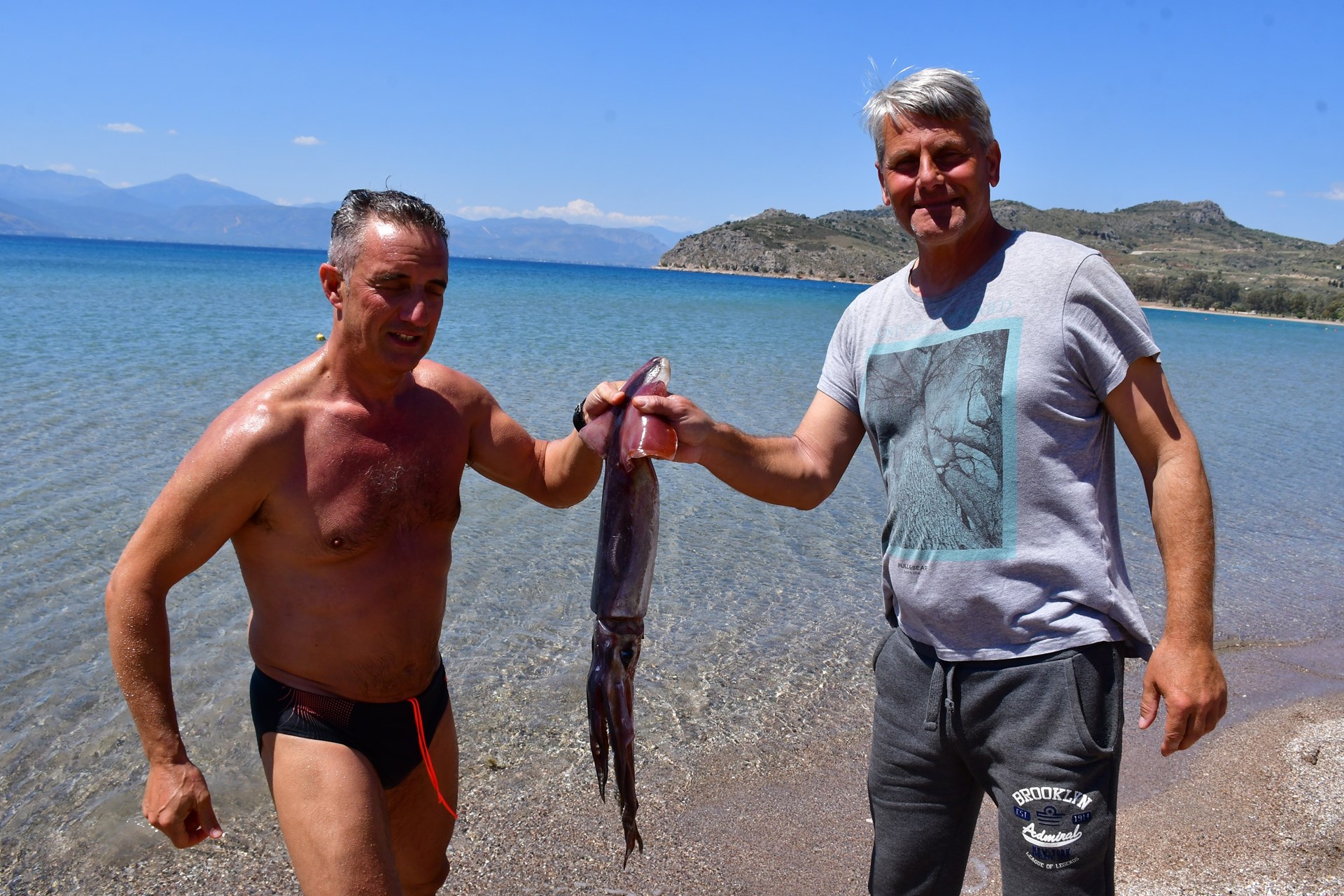 Ένα καλαμάρι γίγαντα έπιασαν δύο λουόμενοι στην παραλία της Καραθώνας, στο Ναύπλιο.