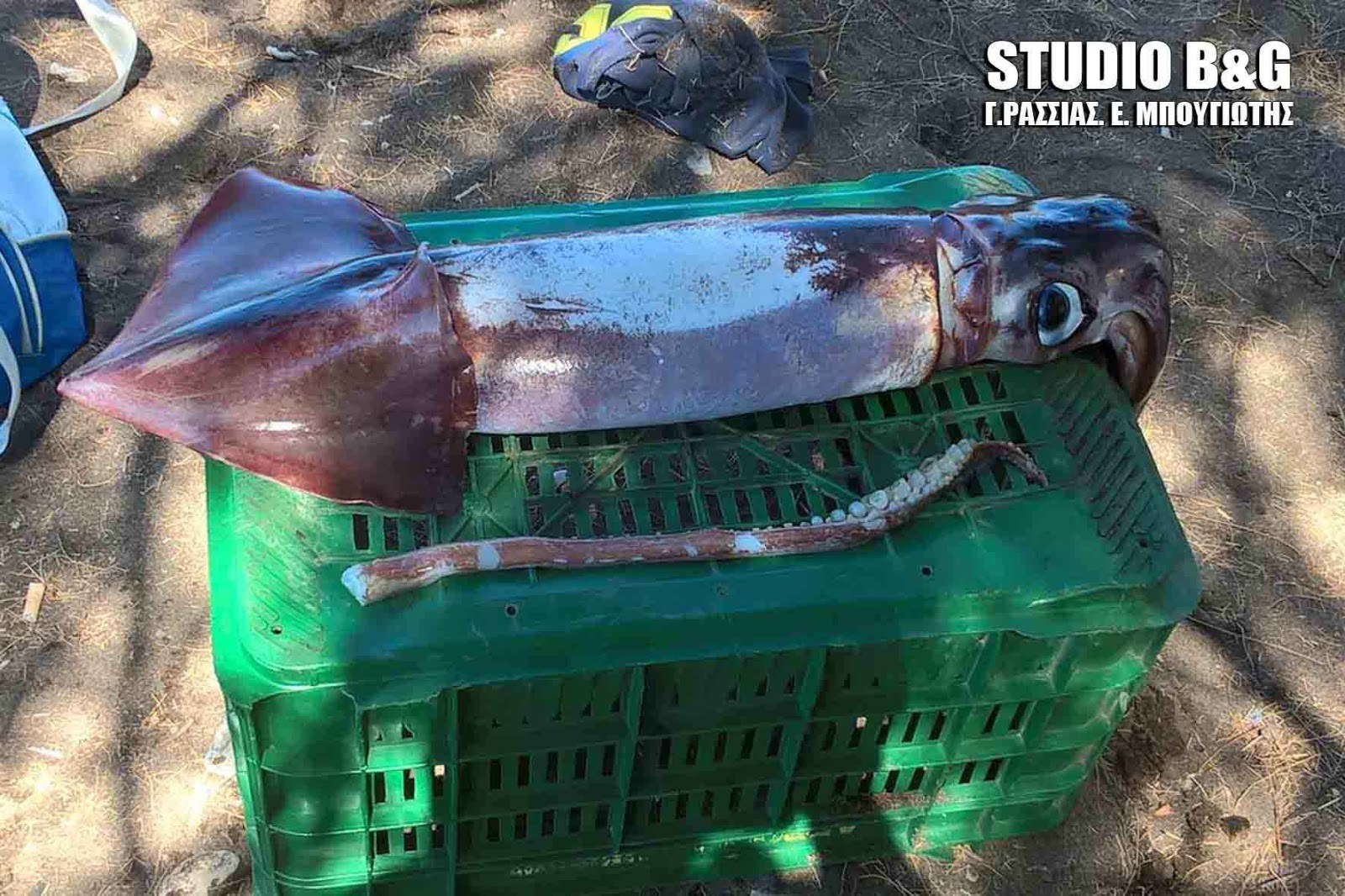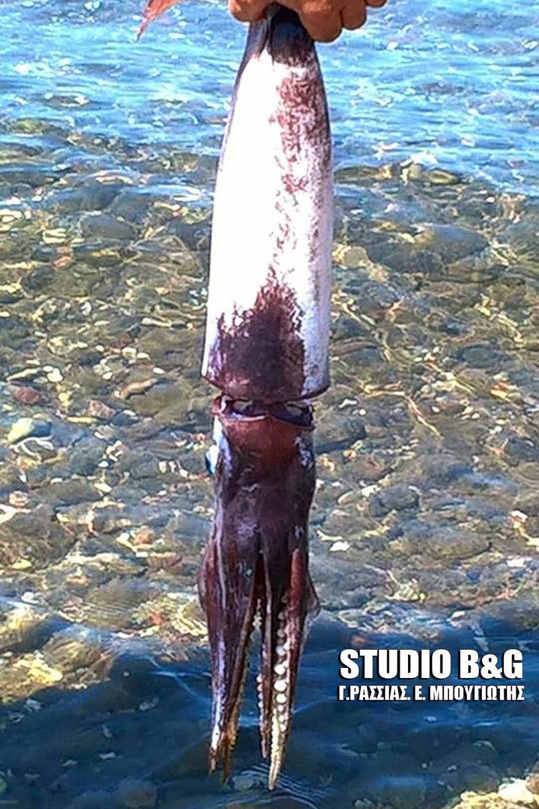 Ένα καλαμάρι γίγας έπιασε σήμερα ένας λουόμενος στην παραλία Ιρίων στον δήμο Ναυπλίου.Ο άνδρας, που είχε πάει με την οικογένειά του στην παραλία για μπάνιο, έκπληκτος είδε το καλαμάρι να κολυμπάει λίγα μέτρα μακριά από την ακτή. Αμέσως βούτηξε και έπιασε το καλαμάρι που ζυγίζει 3 ολόκληρα κιλά και το οποίο έγινε η… ατραξιόν της παραλίας.