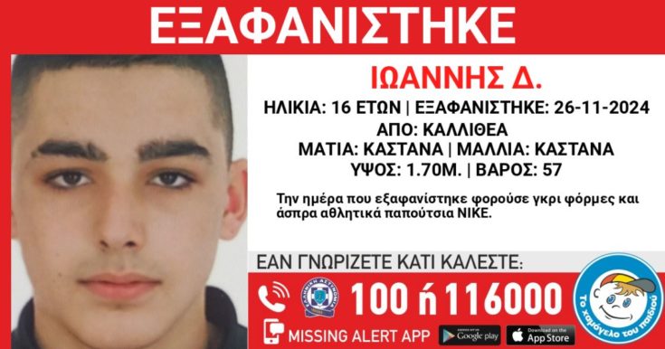 Συναγερμός έχει σημάνει στις Αρχές για την εξαφάνιση του 16χρονου Ιωάννη Δ., τα ίχνη του οποίου χάθηκαν στην Καλλιθέα, και αναζητείται από το πρωί της Τρίτης (26/11).