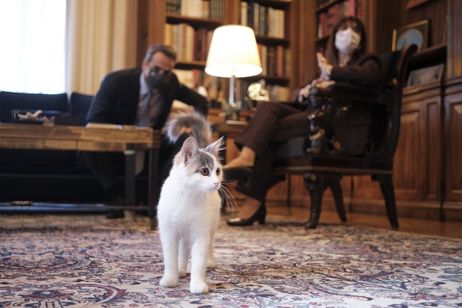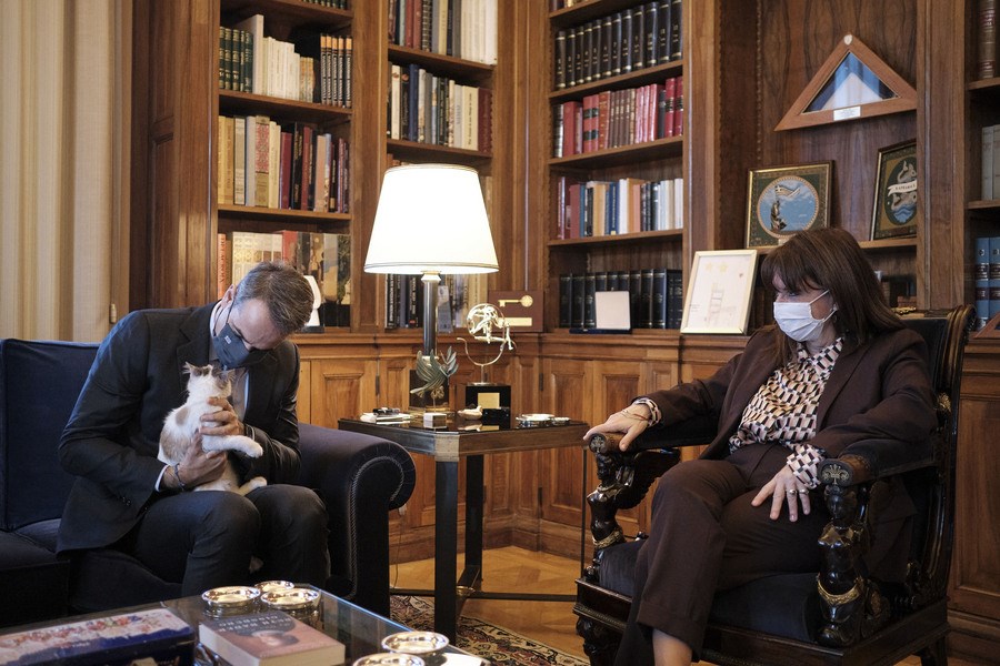 Κατά τη διάρκεια της συνάντησης, τα νιαουρίσματα της γάτας “διέκοψαν” ευχάριστα τη συζήτηση, με την κ. Σακελλαροπούλου να “συστήνει” την “Καλυψώ” στον κ. Μητσοτάκη, ο οποίος την κράτησε κάποια στιγμή στην αγκαλιά του.
