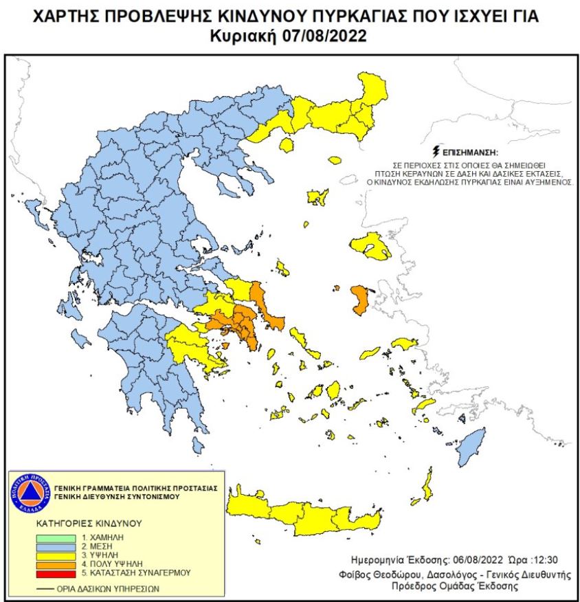Σύμφωνα με το Χάρτη Πρόβλεψης Κινδύνου Πυρκαγιάς που εκδίδει η Γενική Γραμματεία Πολιτικής Προστασίας του Υπουργείου Κλιματικής Κρίσης & Πολιτικής Προστασίας (www.civilprotection.gr), για σήμερα Κυριακή 7 Αυγούστου 2022, προβλέπεται πολύ υψηλός κίνδυνος πυρκαγιάς (κατηγορία κινδύνου 4) για τις εξής περιοχές: