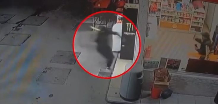 Στο βίντεο, που μετέδωσε το MEGA, διακρίνεται ο ληστής να προσεγγίζει το πρατήριο υγρών καυσίμων και να απειλεί τον υπάλληλο με ένα σφυρί. Ο εργαζόμενος εκείνη την ώρα σκούπιζε.
