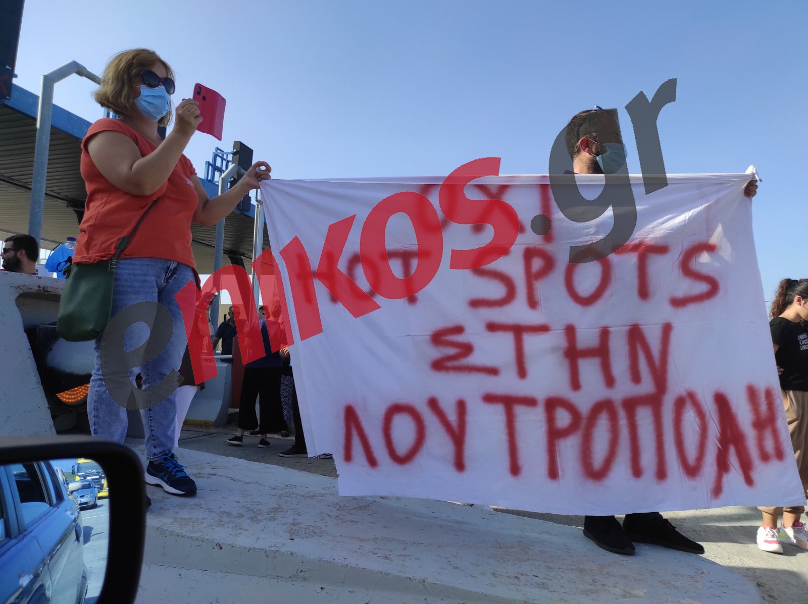 Στις φωτογραφίες που έστειλε αναγνώστης του enikos.gr, φαίνονται οι κάτοικοι των Καμένων Βούρλων να έχουν αποκλείσει τη διέλευση αυτοκινήτων από τα διόδια, ενώ κρατάνε και πανό που γράφουν “ΟΧΙ HOTSPOTS ΣΤΗ ΛΟΥΤΡΟΠΟΛΗ”.