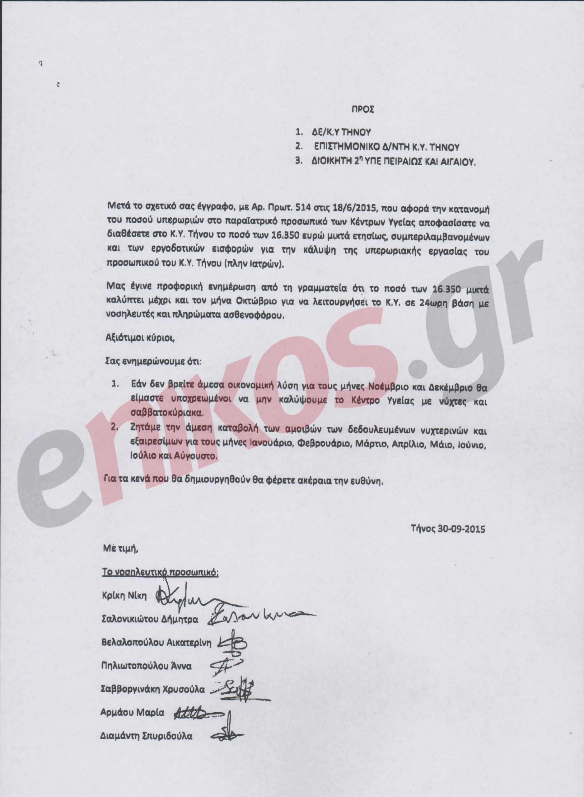 Καμπανάκι χτυπά το νοσηλευτικό προσωπικό του κέντρου Υγείας της Τήνου καθώς ζητά μέσω επιστολής την άμεση καταβολή των δεδουλευμένων νυχτερινών και εξαιρεσίμων για τους μήνες Ιανουάριο μέχρι και Αύγουστο, αλλιώς οι νοσηλευτές δεν θα καλύψουν το κέντρο Υγείας με νύχτες και Σαββατοκύριακα.