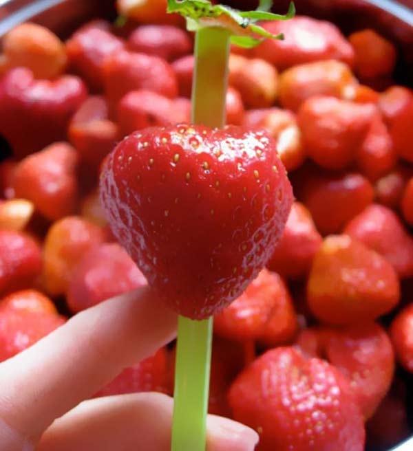 2. Για να αφαιρέσετε εύκολα το κοτσάνι της φράουλας καρφώστε ένα ξυλάκι παγωτού από κάτω προς τα πάνω.
