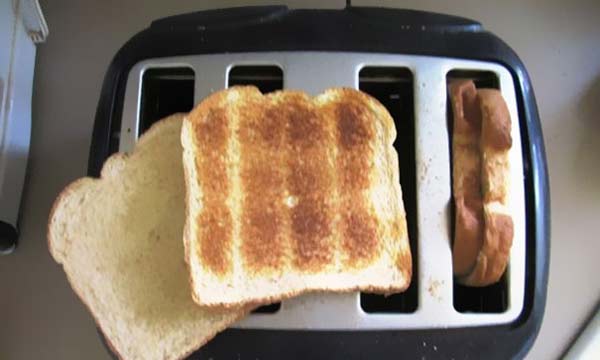 5. Βάλτε στη φρυγανιέρα δύο φέτες ψωμιού του τοστ στην ίδια υποδοχή για να ξεροψηθούν απ’ έξω και να μείνουν αφράτες από μέσα.