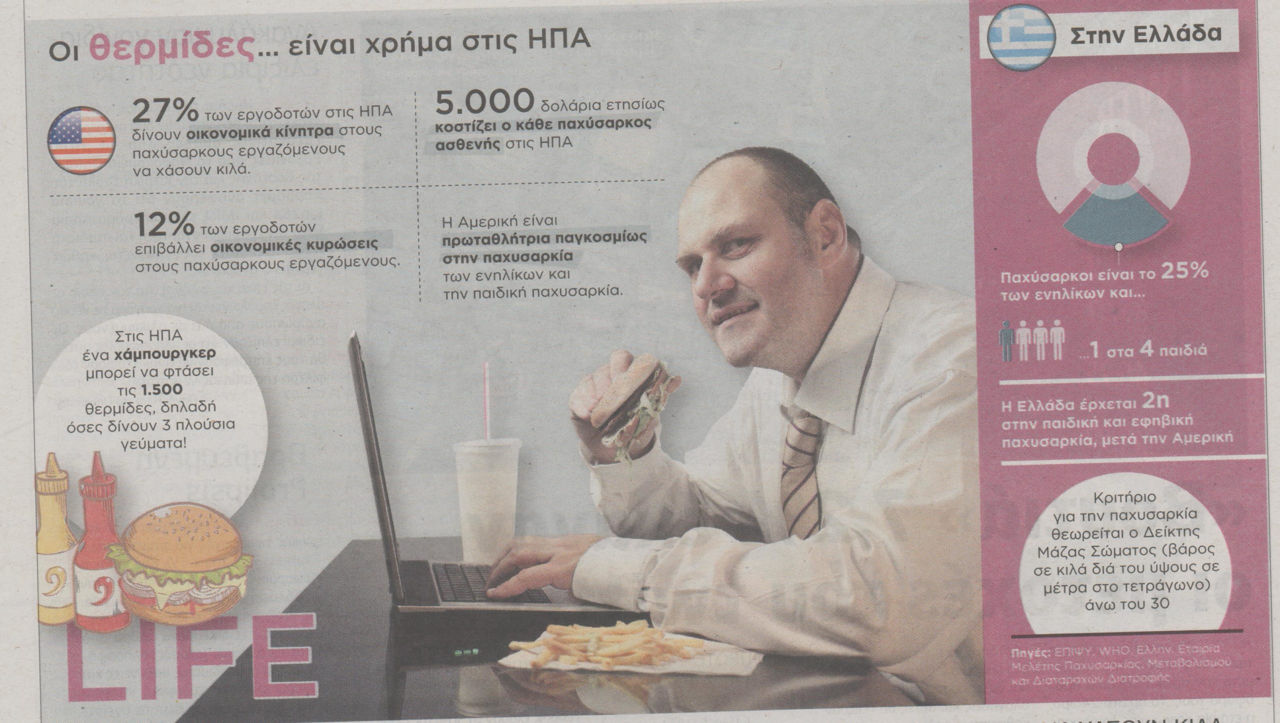 «Σύμφωνα με πρόσφατες έρευνες, το 27% των εργοδοτών στις ΗΠΑ δίνουν κίνητρα στους παχύσαρκους υπαλλήλους οι οποίοι έχουν δείκτη μάζας σώματος άνω του 30 να αδυνατίσουν, με συχνότερο κίνητρο τη μείωση των ασφαλιστικών εισφορών.