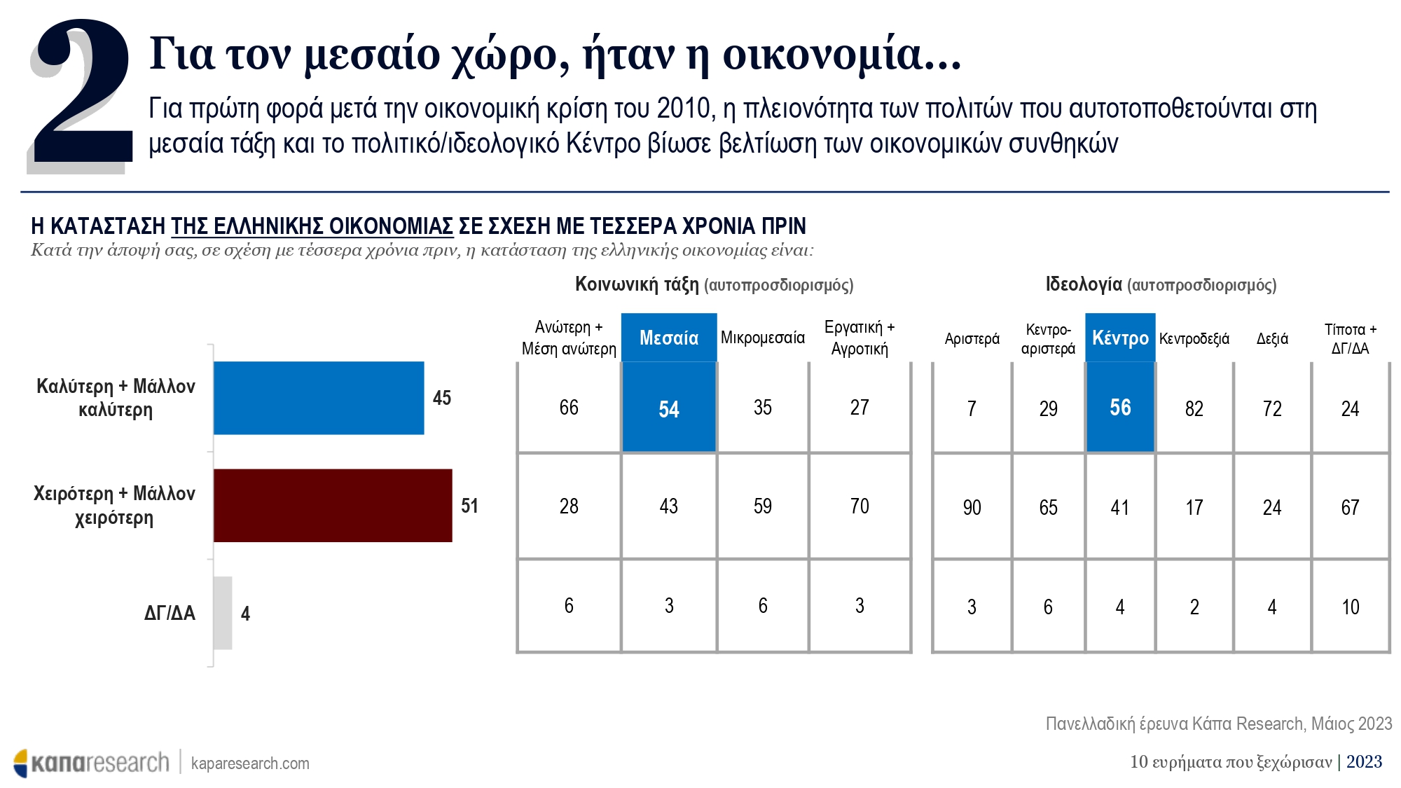 Για πρώτη φορά μετά την οικονομική κρίση του 2010, η πλειονότητα των πολιτών που αυτοτοποθετούνται στη μεσαία τάξη και το πολιτικό/ιδεολογικό Κέντρο βίωσε βελτίωση των οικονομικών συνθηκών