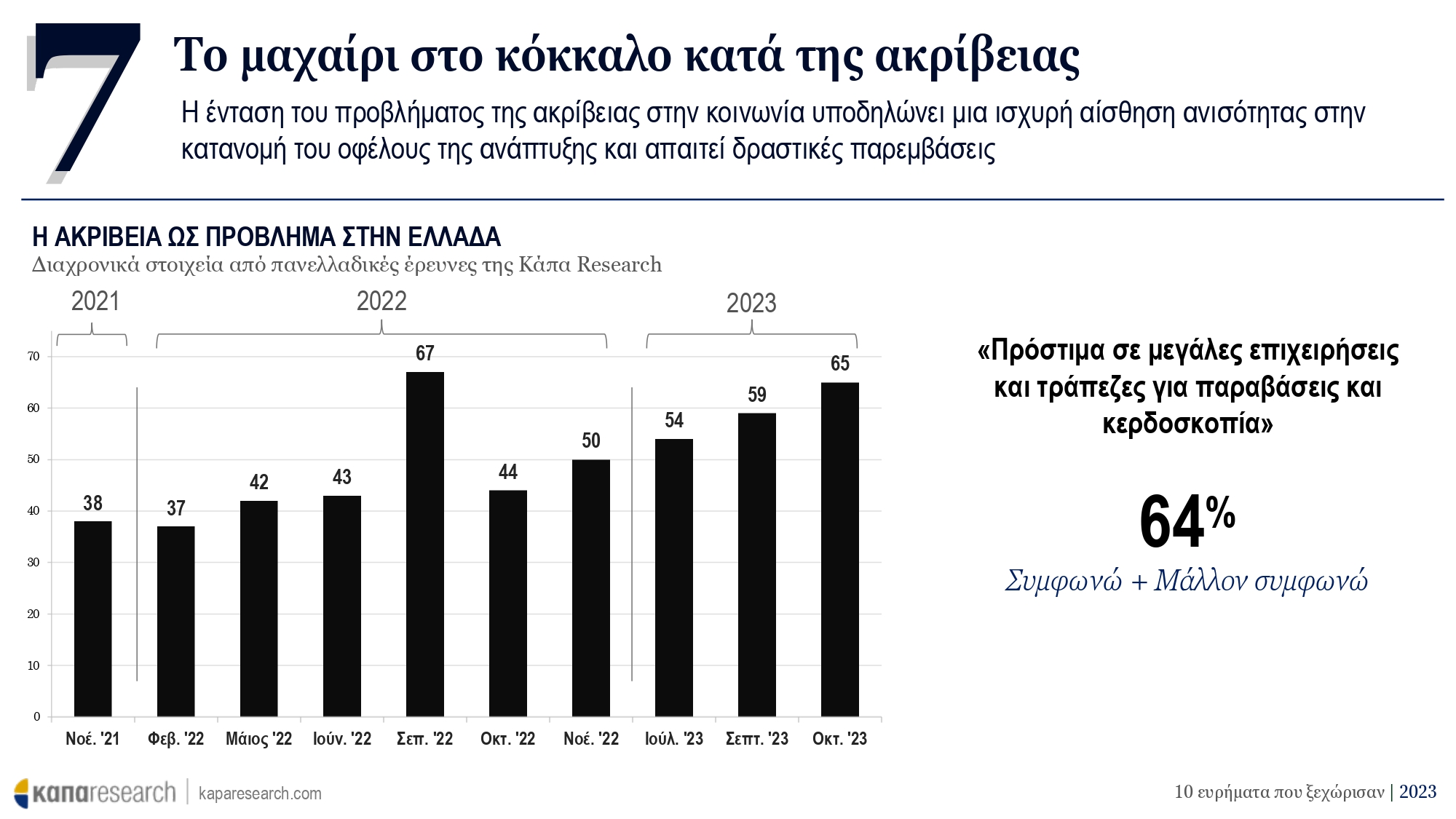 Σύμφωνα με την ανασκόπηση της χρονιάς από την Κάπα Research, το 2023 επικράτησε η ανάγκη για σταθερότητα μετά την αλληλουχία κρίσεων (οικονοµικής, υγειονοµικής, γεωπολιτικής, ενεργειακής), ενώ ένα από τα θέματα που απασχόλησε περισσότερο τους πολίτες ήταν η ακρίβεια, η οποία συνεχίζει να πλήττει τα ελληνικά νοικοκυριά.