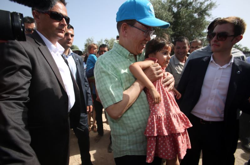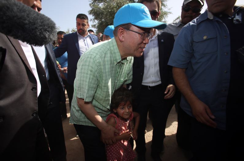 Όπως φαίνεται και στις φωτογραφίες, ο Μπαν Κι Μουν συνομίλησε με πρόσφυγες που φιλοξενούνται στον καταυλισμό, ενώ πήρε στην αγκαλιά του και ένα νεαρό κορίτσι.
