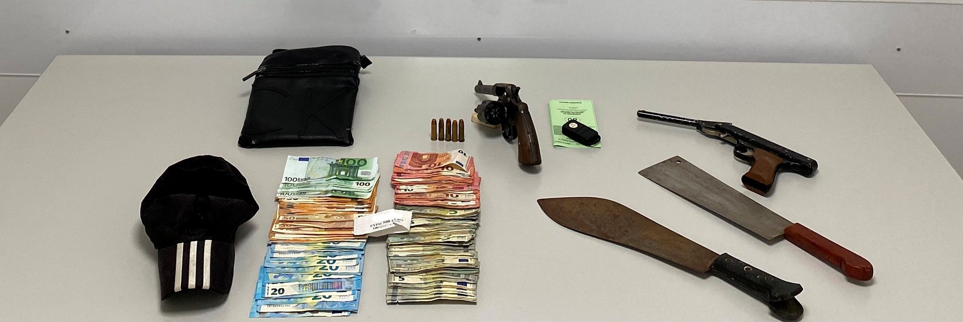 Σε σωματική έρευνα που διενεργήθηκε στον 42χρονο βρέθηκαν και κατασχέθηκαν: περίστροφο με -5- φυσίγγια, χρηματικό ποσό, είδη αμφίεσης που χρησιμοποίησαν για τη ληστεία, συσκευή κινητού τηλεφώνου. Σε σωματική έρευνα που ενεργήθηκε στον 58χρονο βρέθηκαν και κατασχέθηκαν: χρηματικό ποσό, συσκευή κινητού τηλεφώνου. Σε έρευνα στο σπίτι του 58χρονου που φιλοξενούσε και τον 42χρονο βρέθηκαν και κατασχέθηκαν: αεροβόλο όπλο, μπαλτάς και μαχαίρι.